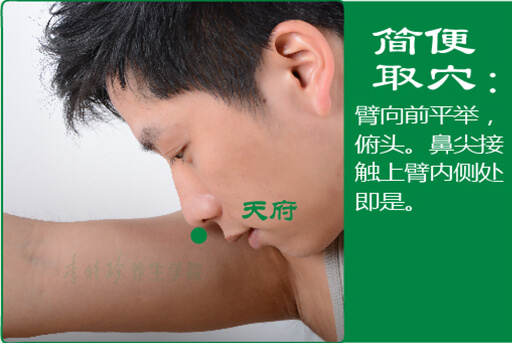 坐位,臂向前平举,伏头。鼻尖接触上臂内侧处即为本穴。