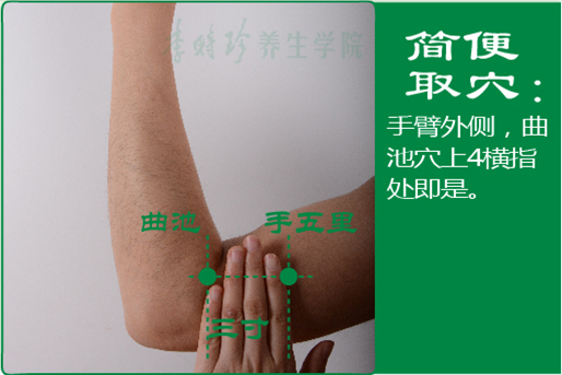 抬臂屈肘。先取曲池(参见“曲池”)与肩髃(参见“肩髃”),从曲池与肩髃连线向上量4横指,即为本穴。