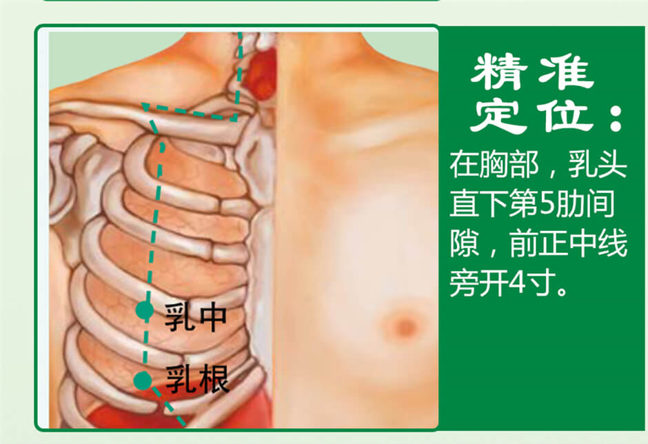 第2步:从乳头沿乳中线(过乳头的垂直线)向下推1个肋间隙(第5肋间隙),按压有酸胀感处,即为本穴。