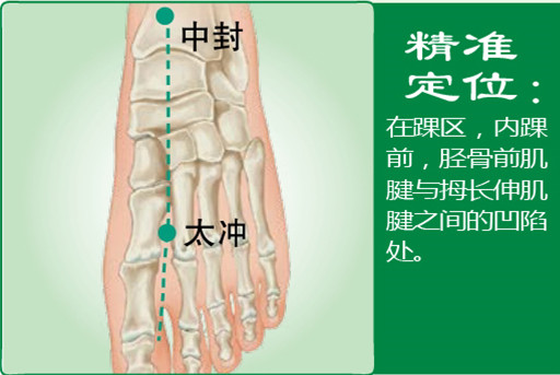 第1步:坐位或仰卧位,拇趾上跷;第2步:足背内侧可见一大筋(胫骨前肌腱),在其内侧、足内踝前下方可触及一凹陷处,即为本穴。