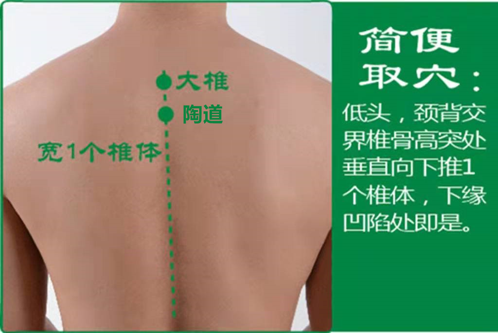 仰卧位或坐位,低头。由颈背部交界处椎骨的一高突处(即第7颈椎)垂直向下推1个椎体(即第1胸椎),其棘突下缘凹陷处,即为本穴。